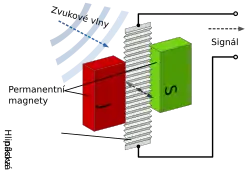 Membrána pohybuje cívkou v magnetickém poli, vytvořeném permanentním magnetem, čímž je vytvářen elektrický proud (viz Zákon elektromagnetické indukce). Dynamické mikrofony jsou méně citlivé než kondenzátorové mikrofony, lépe proto zpracují například hlasitý zpěv při živých vystoupeních, ozvučení veřejných shromáždění apod. Bývají poměrně odolné proti mechanickému poškození. Nevyžadují napájení. Citlivost na 1 kHz nebo napětí je u dynamického středoohmového 3–5 mV/Pa a u dynamického vysokoohmového 10 mV/Pa.