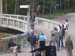- tyčka (angl. boom) je několikametrová zpravidla teleskopická tyč vyrobená z lehkého moderního materiálu (např. kevlar]). Při filmování hraných filmů ji drží mikrofonista (také „asistent zvuku“) tak, aby snímala zvuk z úst herců, aniž by byla vidět v záběru kamery. Tyčce se také běžně přezdívá „tágo“ nebo „bambus“(kdysi se u nás totiž k těmto účelům užívalo bambusových tyčí).