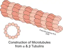Jeden mikrotubulus je dutý váleček, který je složen ze 13 protofilament, tzn. má na průřezu do kruhu poskládáno hned 13 molekul tubulinu. Z boku na sebe interagují v mikrotubulu vždy alfa-tubulin s alfa-tubulinem a beta-tubulin s beta-tubulinem.