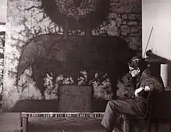 V této etapě motiv obrazu v obraze vytváří imaginativní prostor, jehož iluzivnost je vzápětí zrazována přímou souvislostí s objekty, které z něj unikají nebo se do něj dobývají na pozadí rozpukané zdi, roztrhaného a hořícího papíru nebo oblohy. Veristické podání prostředky iluzivní malby umocňuje reálnost básnické vize. Podstatu básnické přízračnosti cyklu Hostina tvoří simultaneita vidin a halucinatorní pronikání objektu objektem.[29]