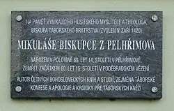 Pamětní deska Mikuláše z Pelhřimova na zdi sborového domu Českobratrské církve evangelické v Pelhřimově v Růžové ulici