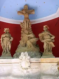 • Sousoší Kalvárie, umístěné na kopci asi půl kilometru severozápadně od zámku, pochází z let 1740–1747. Donátorem díla, zhotoveného z pískovce, byl Zikmund Gustav Hrzán z Harasova, jehož znak je vytesaný na soklu. Autor sousoší není znám. V roce 1841 nad ním byla postavena kaple.[23]