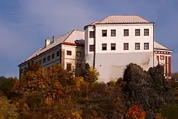 Další stavební aktivitou Anny Zikmundy Hrzánové bylo vdovské sídlo, malý zámeček v sousedství hlavní rezidence, dnes čp. 47. Rovněž tato budova byla postavena ve druhém desetiletí 18. století. Po smrti stavebnice v roce 1730 byla opuštěna. V polovině 18. století bylo k zámečku přistaveno hospodářské křídlo, od roku 1818 využívané jako židovská modlitebna. Zámeček se stal sídlem lesního úřadu. V roce 1782 na něj byly osazeny sluneční hodiny z dílny berounského hodináře Engelbrechta.[14]
