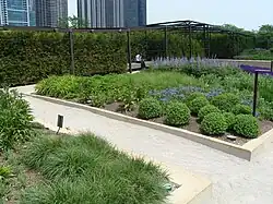 Kathryn Gustafson, krajinná architektka, obecně známá pro své sochařské úpravy parků a tvorbu živých vodních prvků, zvláště londýnské fontány Diana, Princess of Wales Memorial Fountain, [5], a Izraeli, proslulý osvětlovací designér a scénograf,[6], vymezili tematické koncepty, jako je například umístění cest, a tvary záhonů s trvalkami.[5] Oudolf, nizozemský mistr trvalek, [6] navrhl květinové záhony, které obsahují 26.000 vytrvalých rostlin, zahrnující 250 odrůd domácích prériových rostlin.[5] Zahrada byla navržena se čtyřmi hlavními komponentami: ohrazující keře, světlá tabule, tmavá tabule a spojující cesta.[8]