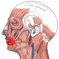 Začíná na mandibule, od okrajů kořenů zevních řezáků a upíná se na kůži rtu. Jeho funkcí je vtahování kůže mezi bradou a rty. Je-li sval rozepjat více kraniálně, tak se dolní předsíň dutiny ústní (vestibulum oris) stává mělkou a tahem sliznice dolního rtu dochází k odchlipování dásně od krčků řezáků, což podporuje vznik paradontózy.