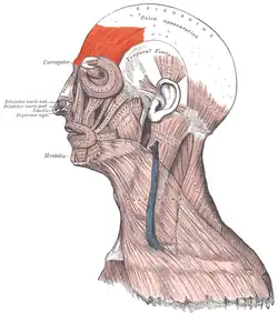 Upíná se do vazivové přilby. Zepředu se do něj upíná sval čelní (musculus frontalis), zezadu sval týlní (musculus occipitalis). Soubor vytváří napětí kůže klenby lebeční.