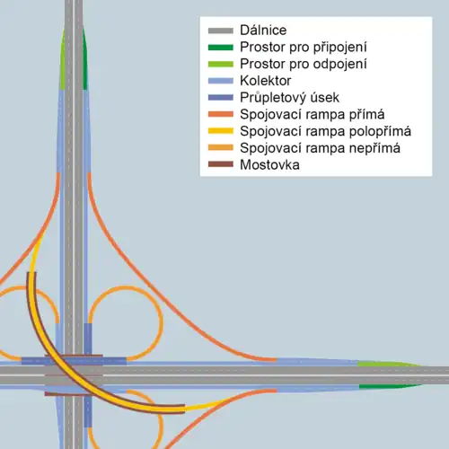 • mimoúrovňová křižovatka útvarová (bez křižných bodů, průpletů a vratných větví)