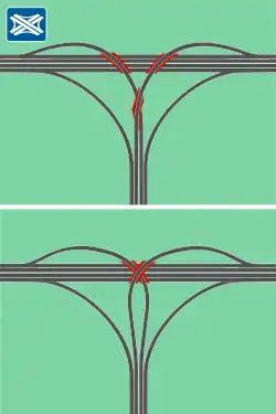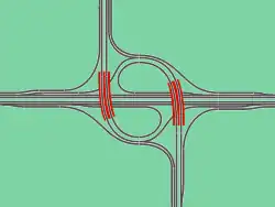 Nahrazení dvou nepřímých ramp rampami polopřímými (např. dálniční křižovatka Oberhausen-West).