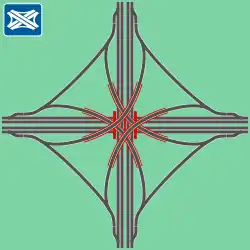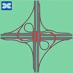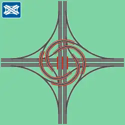 • ve Spojeném království: dálniční křižovatka Leicester (South) (základní podoba), dálniční křižovatka Lofthouse Interchange (základní podoba), dálniční křižovatka Tarbock Island (základní podoba), dálniční křižovcatka Simister Interchange (upravená podoba)