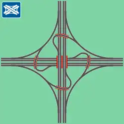 Tento typ mimoúrovňové křižovatky je vhodný v situacích, kdy se předpokládá výrazně převažující dopravní vytížení jen v přímých směrech křížených komunikací a současně minimální vytížení spojovacích ramp.