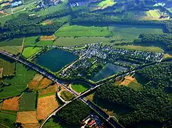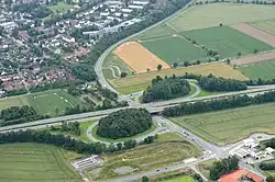 Příklad mimoúrovňové křižovatky s křižnými body: dálniční sjezd na dálnici A 445 u Werlu provedený v podobě polovičního čtyřlístkového typu