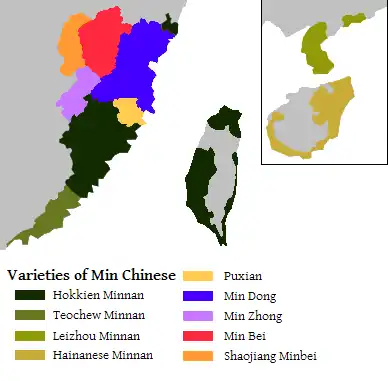 - Chajnanština – ostrov Chaj-nan (někdy vydělována jako samostatná skupina v rámci minu)