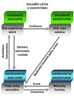 Obecný popis biogeochemických cyklů, které probíhají mezi těmito čtyřmi zdroji je znázorněn na obrázku vpravo, kde jsou šipkami znázorněny biologické a geologické procesy, díky nimž dochází k pohybu látek mezi jednotlivými zdroji. Rychlost s jakou jednotlivé prvky cirkulují v ekosystémech je závislá na rychlosti rozkladných procesů. Faktory, které tyto dekompoziční procesy ovlivňují jsou: teplota, přítomnost vody, přítomnost kyslíku (O2), chemické složení půdy a v neposlední řadě i vliv člověka na ekosystémy a biosféru.[38]
