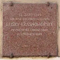Při oslavách 70 let narození zakladatelky školy Elišky Krásnohorské v roce 1917 byla škola na její počest přejmenována z Městského dívčího gymnázia Minerva na Městské dívčí reálné gymnázium Krásnohorská.[6]