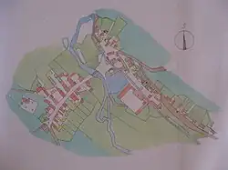 Pro vznik a urbanismus Minic bylo rozhodující, že ležely na cestě, spojující královská města Žatec a Most.[12] Původní středověká vesnice se rozkládala na pravém břehu Chomutovky, která se ve středověku nazývala Úzká. Osu jejího jádra tvořila zmíněná cesta, procházející vesnicí od jihozápadu k severovýchodu. Po obou stranách cesty ležely zemědělské usedlosti, jednalo se o takzvanou ulicovku.[13] Na jihozápadě tvořil hranici vesnice kostel sv. Martina, na severovýchodě pak hospodářský dvůr s panským sídlem, které se rozprostíraly na opačném břehu říčky. Severovýchodní hranici dvora tvořil již zaniklý mlýnský náhon, který tvořil, spolu s Chomutovkou, opevnění tvrze. Někdy po polovině 17. století začala vznikat zástavba i na severovýchodním břehu říčky.