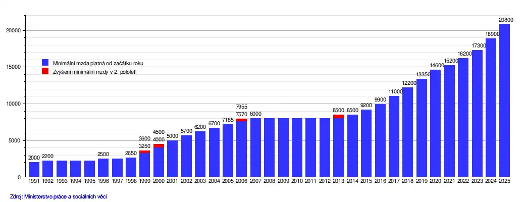 Následující graf ukazuje vývoj částky minimální mzdy v Česku od roku 1991: