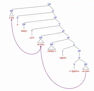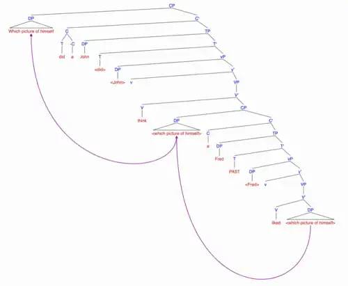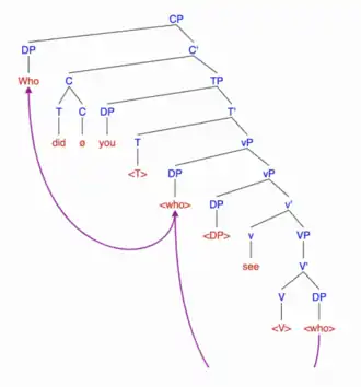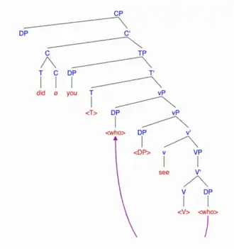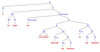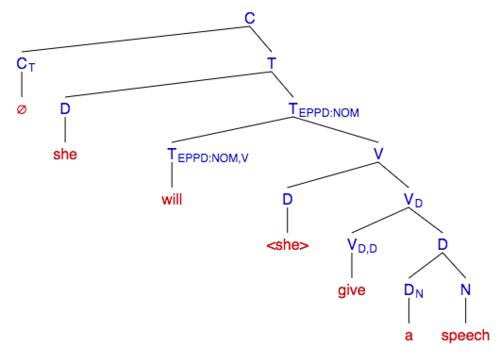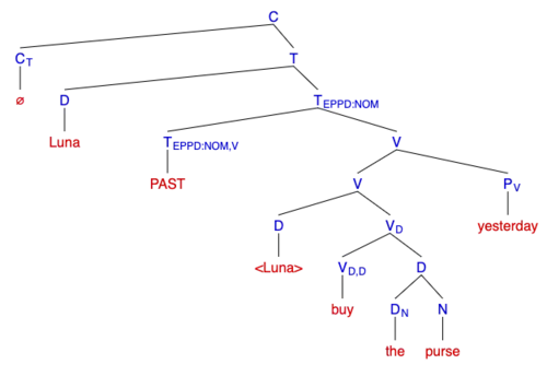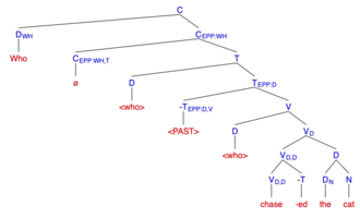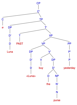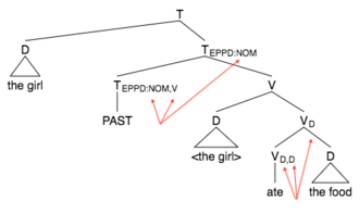 - PAST lexikální položka pro „minulý čas“ je reprezentována jako rys. Čas vyžaduje přítomnost DP podmětu a sloveso; což zapisujeme jako TD,V. (Nebo přesněji jako TEPP:D.NOM,V. „EPP“ notace znamená „rozšířený princip projekce“ rys, NOM znamená „nominativ“.) Čas (Tense) se nejdříve slučuje s V-projekcí, a výstup pak kombinuje DP podmět the girl, který se, v určitém smyslu, slučuje dvakrát: jednou při V-projekci, a podruhé při T-projekci. (Viz diskuze o Přesunu níže.)