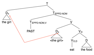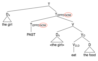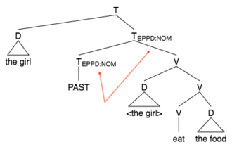 Přesun jako kontrola rysů: Původní formulace rozšířeného principu projekce tvrdí, že věta musí obsahovat podmět na pozici specifikátoru spec TP/IP.[15] Ve výše ukázaném stromě existuje rys EPP. Jedná se o silný rys, který vynucuje opětovné Sloučení – nazývané interní sloučení – determinátorové fráze the girl. EPP rys ve výše znázorněném stromě je znázorněn dolním indexem u hlavy T, který indikuje, že T vyžaduje podmět v pozici specifikátoru. To způsobí přesun objektu the girl na pozici specifikátoru T.[12]