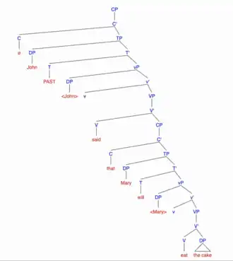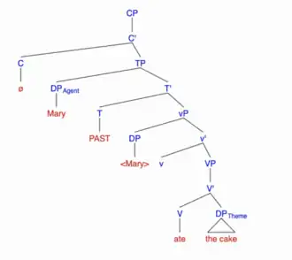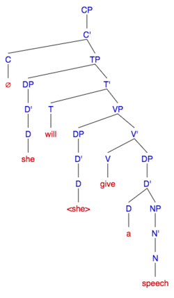 - C∅ lexikální položka pro určení typu věty je fonologicky nulová C∅. Podle hypotézy jsou všechny věty klauzemi (složkami CP), takže kořenová věta The girl ate the food je analyzovány jako CP. Za předpokladu, že všechny fráze mají hlavu (jsou endocentrické), musí být C hlavou CP. C vybírá TP, což zapisujeme jako CT.