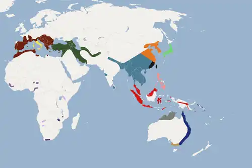 V prvním případě je Miniopterus schreibersii jedním z nejrozšířenějších savců světa, rozšířen skrze palearktickou, afrotropickou, orientální a australskou zoogeografickou oblast.[8] Areál výskytu se táhne od střední a jižní po jihovýchodní Evropu, ostrůvkovitě do severní a subsaharské Afriky, poté skrze jižní, jihovýchodní a východní Asii včetně Japonska a Filipín až na sever a východ Austrálie, na Novou Guineu a Šalomounovy ostrovy.[7][16] V Austrálii jsou uváděny tři možné poddruhy: severně žijící orianae, oceanensis z východních oblastí a bassanii z jižních částí států Jižní Austrálie a Victoria.[17]