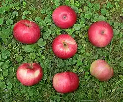 Plody jsou kulovité, mírně spoštělé, středně veliké, při nadúrodě menší. Základní barvou plodů je žlutá, která je z větší části (někdy zcela) překryta zářivou červení. Červená plocha je zčásti slabě žíhaná. Slupka je hladká, lesklá. Dužnina je bílá, křehká, velmi šťavnatá, chuťově sladce navinulá, dobrá až velmi dobrá a na řezu jen slabě hnědne. Plody je možno v chladu asi měsíc skladovat bez výrazné újmy na kvalitě.