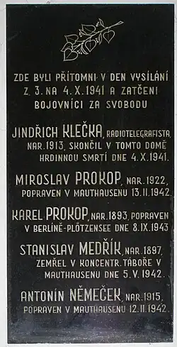 - ↑ 1941: Jediné radiové spojení s Londýnem zajišťovali odbojáři z Jinonic [online]. Česká televize, ČT24, Regiony, Praha: www.ceskatelevize.cz, 2014-10-03 [cit. 2014-10-05]. Dostupné online.