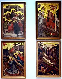 - Rajhradský oltář, 5 desek s výjevy Nesení Kříže[3] (polovina centrální části oltáře), Poslední večeře, Kristus na hoře Olivetské (nebo Modlitba v zahradě Getsemanské), Zmrtvýchvstání Krista, Nalezení a zkoušení pravého sv. Kříže sv. Helenou a Konstantinem (oltářní křídla), Moravská galerie v Brně