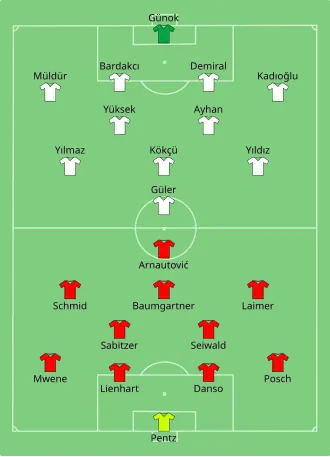 - ↑ Bertuğ Yıldırım obdržel červenou kartu na lavičce, i přes to, že do zápasu nenastoupil.