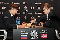 Karjakin | Carlsen | New York 2016 12 partií klasicky, případně tie-break rapid, Carlsen vyhrál po tie-breaku (klasické 6:6 (+1 -1 =10), tie-break 3:1 (+2 -0 =2)) | ||