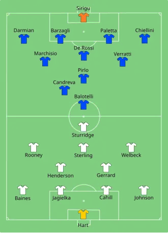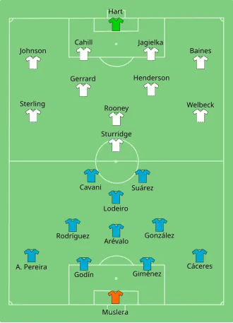 Oba týmy se spolu střetly v předchozích deseti utkáních, včetně dvou Mistrovství světa (1954, čtvrtfinále: Uruguay 4:2 Anglie; 1966, základní skupina: Uruguay 0:0 Anglie).[3] Uruguayský obránce Maximiliano Pereira byl suspendován na tento zápas, poté, co byl vyloučen v utkání proti Kostarice.