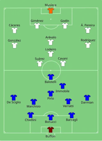 Takticky vedený zápas, mezi těmito dvěma týmy (a bývalými světovými šampiony) šlo o přímý postup do osmifinále. Itálii stačila díky lepšímu skóre i remíza, Uruguay potřebovalo jakoukoli výhru. Utkání poznamenalo vyloučení italského záložníka Claudia Marchisia a také zkrat uruguayského kanonýra Luise Suáreze, který pokousal protihráče Giorgia Chielliniho a přesto nebyl vyloučen. Avšak po přehodnocení a prozkoumání tohoto prohřešku rozhodla disciplinární komise FIFA udělit mu přísný trest, ve kterém nesmí za Uruguay na mezinárodní scéně nastoupit v devíti utkáních a navíc má na čtyři měsíce zastavenou činnost ve všech fotbalových soutěžích.[6] Italové inkasovali o chvíli později gól od Diega Godína po centru ze strany, který je poslal ze šampionátu domů.[7][8]