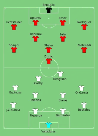 Vítězství Švýcarska 3:0 zařídil hattrickem Xherdan Shaqiri, který ještě před zápasem poznamenal, že samotný hráč v utkání moc nezmůže. Byl to druhý hattrick na tomto šampionátu (první vstřelil Němec Thomas Müller proti Portugalsku v základní skupině G) a jubilejní padesátý v historii mistrovství světa. Švýcarsko postoupilo do osmifinále.[6]