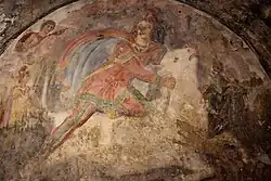 Římská freska tauroktonie, na níž Mithras zabíjí svým mečem (či dýkou) býka, s dalšími výjevy z života boha.