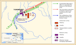 V roce 69 př. n. l. se Tigranes zapletl do konfliktu s Římem tím, že odmítl vydat Římanům svého tchána Mithridata. Lucullus vpadl do Arménie na jaře následujícího roku. Táhl na arménské hlavní město Tigranakert. V bitvě poblíž města porazil na hlavu arménskou armádu. V létě roku 68 př. n. l. porazil další arménské síly v bitvě u Artašatu. Poté oblehl město Nisibis (dnešní Nusaybin), hlavní pevnost a pokladnici severní Mezopotámie. Město padlo do rukou Luculla v zimě roku 68 př. n. l.