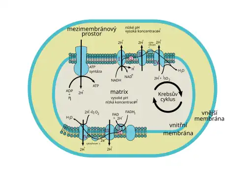 V mitochondriích probíhá převážná část buněčného dýchání (vyjma zejména glykolýzy, jež probíhá v cytosolu). Tento sled reakcí představuje rozklad různých organických látek, čímž se získává energie potřebná pro syntézu adenosintrifosfátu (ATP) z ADP. Výchozí látkou jsou zejména pyruvát a mastné kyseliny, obě látky v mitochondriální matrix prochází reakcemi, při nichž vzniká acetylkoenzym A (pyruvát prochází dekarboxylací, mastné kyseliny beta-oxidací). Acetylkoenzym A následně vstupuje do Krebsova cyklu, což je série reakcí, které umožňují redukci koenzymů NAD+ na NADH a FAD na FADH2. Elektrony z těchto koenzymů jsou předávány do dýchacího řetězce, jenž je umístěn na vnitřní membráně mitochondrie. Dýchací řetězec přenáší do mezimembránového prostoru vodíkové kationty (H+, čímž vzniká v prostoru mezi membránami kyselé pH. Toto pH má tendenci se vyrovnávat, a tak prochází otvorem v enzymu ATP syntáze zpět dovnitř buňky. Průchodem H+ však tento enzym vytváří ATP, jež je kýženým produktem celého sledu reakcí.[32]