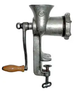 Ruční mlýnky na maso s pohonem klikou jsou obvykle litinové nebo z nerezové oceli, ale mohou být vyrobeny i z tvrdé hliníkové slitiny (leštěný odlitek). Princip činnosti ručního mlýnku je jednoduchý. Do prostoru pro vkládání potravin v horní části mlýnku se umístí maso, které se po zatlačení pěchovadlem dostane do bezprostřední blízkosti protlačovacího šneku. Rotujícím šnekem je maso dopraveno k nožům na konci hřídele, kde je rozřezáno a tlačeno přes průtlačnou destičku (matrici, hovorově "šajbu") ven z mlýnku, obvykle do předem připravené nádoby. Průměr otvorů v průtlačné destičce bývá nejčastěji 5 mm nebo 8 mm.