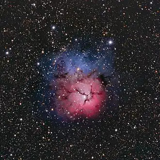 Mlhovina Trifid je tvořena třemi různými mlhovinami: emisní mlhovinou, která tvoří prostřední červenou část, modrou reflexní mlhovinou na okraji a temnou mlhovinou uprostřed, která způsobila její název.