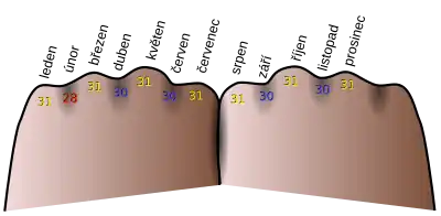 Pro zapamatování počtu dní měsíců existuje jednoduchá pomůcka – zatnutím pěstí v obou rukách a jejich přiložení k sobě vzniknou pomyslné vrcholy a prohlubně, kde vrcholy všech kloubů symbolizují měsíc s 31 dny a prostory mezi klouby (prohlubně) symbolizují měsíc s 30 nebo 28/29 dny (u únoru). Měsíce se vyjmenovávají zleva, takže: