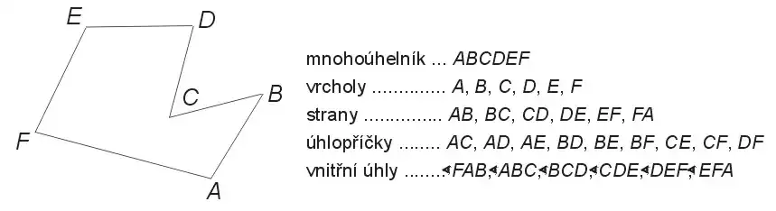 Body, které určují mnohoúhelník, se nazývají vrcholy mnohoúhelníku. Úsečky, které spojují sousední vrcholy, se nazývají strany mnohoúhelníku. Úsečky, které spojují nesousední vrcholy, se nazývají úhlopříčky. Úhly, které svírají sousední strany, se nazývají vnitřní úhly mnohoúhelníka. Počet vrcholů, stran a vnitřních úhlů je v jednom mnohoúhelníku stejný a tento počet určuje název mnohoúhelníku: trojúhelník, čtyřúhelník, pětiúhelník, šestiúhelník… (obecně -úhelník).
