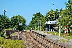 Zastávka je jednokolejná s odbočnou manipulační kolejí, která byla využívána pro nakládku železničních vagónů dřevem ze zdejší pily. Nádražní budova, jež je umístěna severně od kolejiště, prošla rekonstrukcí, naopak nákladiště, umístěné jižně od kolejiště, ztratilo po zrušení pily svou funkci.[4] Východně od zastávky se nachází železniční přejezd, na kterém místní komunikace křižuje železniční trať. Nedaleko přejezdu došlo 17. prosince 2022 k dopravní nehodě, kdy kůň, který utekl majiteli, vběhl pod kola přijíždějícímu vlaku. Došlo ke srážce, jež zvíře poranila natolik, že muselo být utraceno. Patnácti cestujícím z vlaku se nic nestalo. Provoz na železnici si kvůli nehodě vyžádal přerušení na půl druhé hodiny.[5]