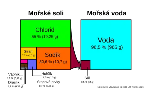 Mořská voda obsahuje množství iontů, které mají buď kladný, nebo záporný náboj. Nejvíce zastoupeny jsou záporné ionty (anionty) chloru a kladné ionty (kationty) sodíku, které dohromady vytvářejí mořskou sůl, známou jako kuchyňská sůl. Ta tvoří 85 % ze všech rozpuštěných látek v mořské vodě.[1]