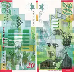 - ↑ Banknotes and Coins Catalog: Twenty New Sheqalim [online]. Banka Izraele [cit. 2010-10-08]. Dostupné online. (anglicky)[nedostupný zdroj]