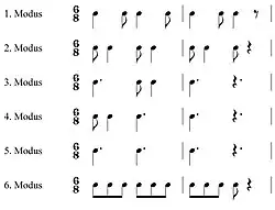 V tehdejší hudbě převládaly rychlé třídobé rytmy a opakovaly se krátké rytmické formule (modi, viz tabulku na obrázku). Ve většině pramenů se uvádí šest rytmických modů, jak bylo poprvé vysvětleno v anonymním pojednání De mensurabili musica z doby kolem roku 1260. (Toto dílo bylo dříve připisováno Johannu de Garlandia, ten je však dnes považován pouze za editora, jenž na konci 13. století upravil text Hieronyma de Moravia[1]). V každém modu se pravidelně střídaly noty krátké (brevis) a dlouhé (longa), přičemž ovšem longa mohla být dvoudobá (imperfecta) nebo třídobá (perfecta) a brevis, obvykle jednodobá, mohla být za určitých okolností prodloužena na dvě doby ("alterována").