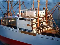 - Nástavba – z vnější strany obsahuje okna, stožár s osvětlením, žebříky a schodiště, uvnitř pak bývá naznačena kormidelna.