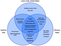 Modré zóny leží ve vyspělých a politicky stabilních zemích s kvalitní zdravotní péčí, v jejich rámci však patří k chudým a odlehlým regionům, kde se zachoval tradiční způsob života. Ke společným vlastnostem těchto komunit patří převaha rostlinné stravy (především luštěniny a ořechy), častá fyzická aktivita, nekuřáctví, vysoká religiozita a funkční rodinné i společenské vazby.[2]