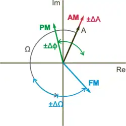 Na přiloženém fázorovém diagramu je fázor nosné znázorněn černou šipkou, která se otáčí konstantní úhlovou frekvencí . Amplitudová modulace během otáčení mění jeho amplitudu, zatímco obě úhlové modulace mění jeho okamžitý úhel. Fázová pouhou změnou fáze (při konstantním modulačním signálu je fázový úhel v čase neměnný), kdežto frekvenční změnou frekvence (při konstantním modulačním signálu se fázový úhel v čase trvale mění konstantní rychlostí).