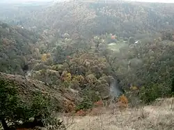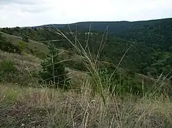 Třetí a poslední částí jsou zalesněné stráně nalézající se na opačném břehu toku. Podloží této oblasti je převážně tvořeno rulami oproti jižně orientovaným svahům z hadců.[4] Severní orientace svahů zapříčiňuje menší dopad slunečního záření, a tudíž je tato oblast chladnější a je pokryta souvislejším lesním porostem.[5] Mikroklima oproti jiným částem stepi zde není tak extrémní a příliš se neliší od širšího okolí. Roste zde např. pěchava vápnomilná (Sesleria caerulea) a žebřice pyrenejská (Libanotis pyrenaica), jež jsou typickou podhorní vegetací.[3][5]