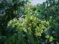 Květenství je tvořeno četnými drobnými květy sestavenými do hustých terminálních jehlanovitých lat dlouhých až 35 cm, které nejčastěji rostou na konci větví. Květy velké do 5 mm rozkvétající před nebo až s počátkem rašením listů, vyrůstají v jednom květenství společně oboupohlavné i jednopohlavné, mají asi 2 mm stopky a drobné kopinaté až čárkovité listeny. Květy jsou pětičetné, nepatrné kališné lístky jsou zelené, trojúhelníkovité, korunní lístky jsou vejčitě podlouhlé, nazpět ohnuté, bělavé a 2,5 mm dlouhé. Deset tyčinek s podlouhlými prašníky je v květu ve dvou kruzích. Kulovitý, svrchní, pětipouzdrý semeník je velký do 1 mm a nese pět čnělek s bliznami. Květy jsou opylovány hlavně včelami slétajícími se za nektarem.