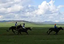 Jízda na koni má v mongolské kultuře obzvlášť ústřední postavení. Závody na dlouhé vzdálenosti, které se předvádějí během festivalu Nádam, jsou jedním z jejích aspektů, stejně jako obliba trikového ježdění. Jedním z příkladů trikové jízdy je legenda, podle níž mongolský vojenský hrdina Damdin Süchbátar rozhazoval mince po zemi a pak je při jízdě na koni v plném trysku sbíral.