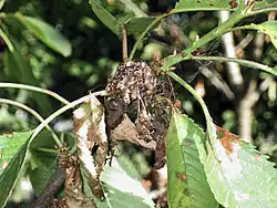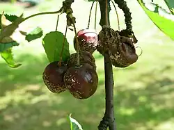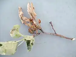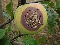 Houba přezimuje ve větvích, ve spadaných plodech, v mumifikovaných plodech na stromě, a na listí.